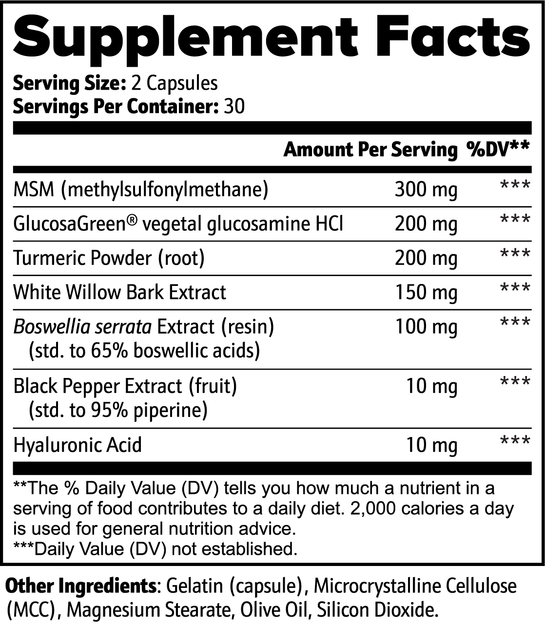MSM (methylsulfonylmethane), GlucosaGreen® vegetal glucosamine HCl, Turmeric Powder (root), White Willow Bark Extract, Boswellia serrata Extract (resin)(std. to 65% boswellic acids), Black Pepper Extract (fruit) (std. to 95% piperine), Hyaluronic Acid, Gelatin (capsule), Microcrystalline Cellulose (MCC), Magnesium Stearate, Olive Oil, Silicon Dioxide.