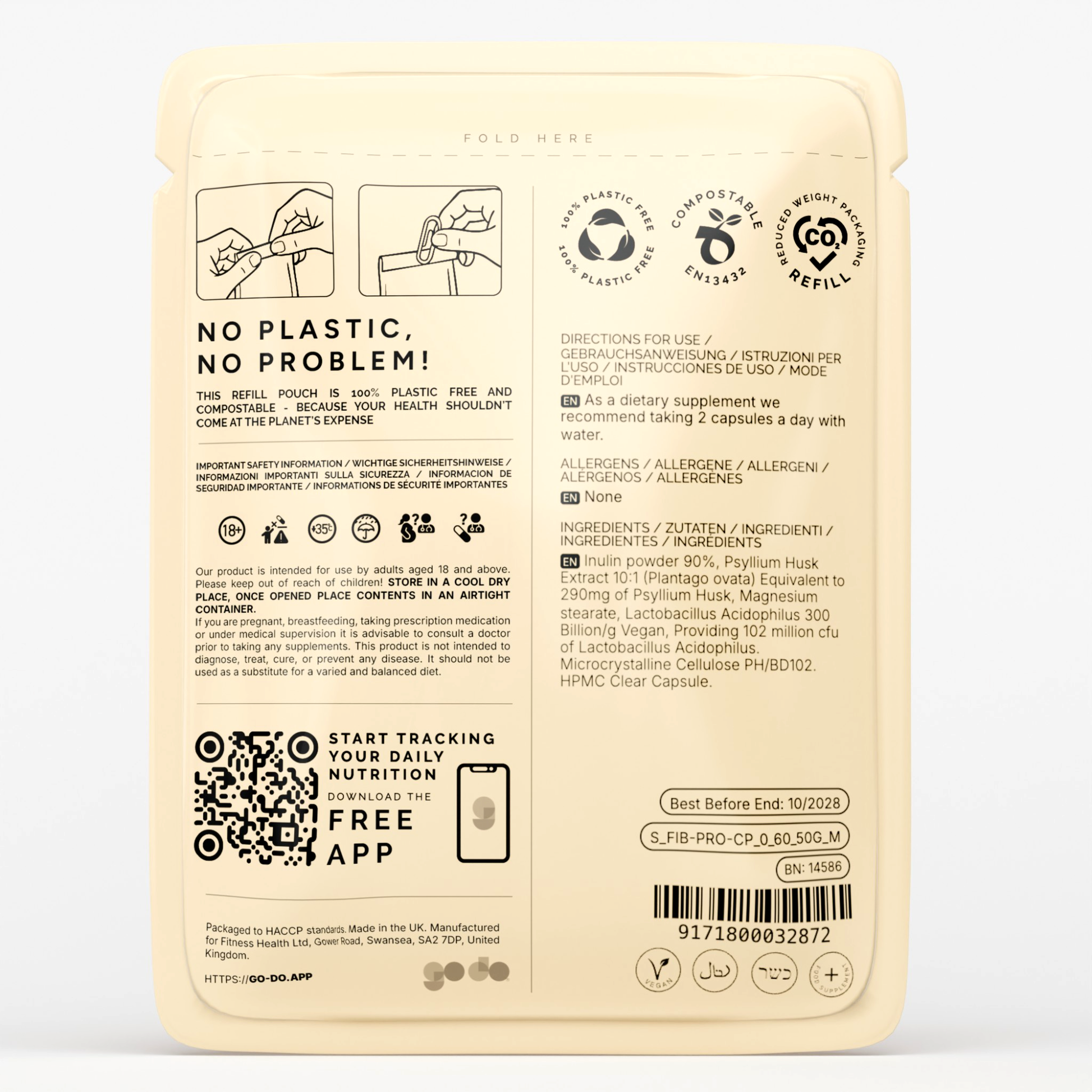 Our Fibre Pro Complex Capsules are rigorously tested for purity and potency. Produced and packed by Fitness Health, a family-run business in South Wales, these capsules are delivered in either a Compostable Pouch and/or a Recyclable Glass Bottle to ensure freshness and convenience.